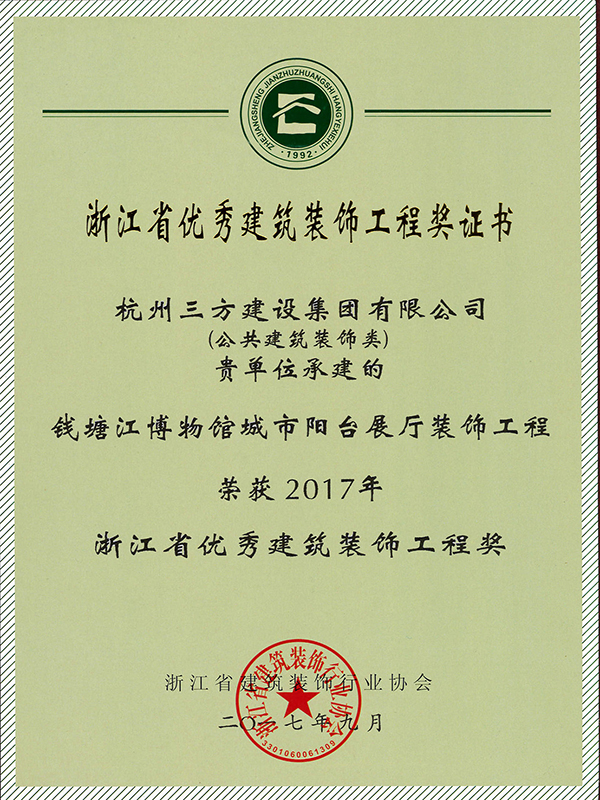 2017年钱塘江博物馆城市阳台展厅装饰工程荣获浙江省优秀建筑装饰工程奖