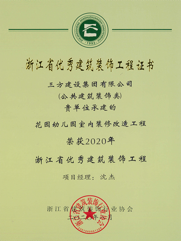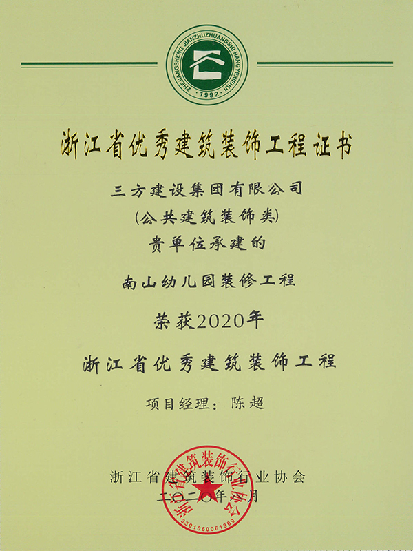 2020年南山幼儿园装修工程荣获浙江省优秀建筑装饰工程