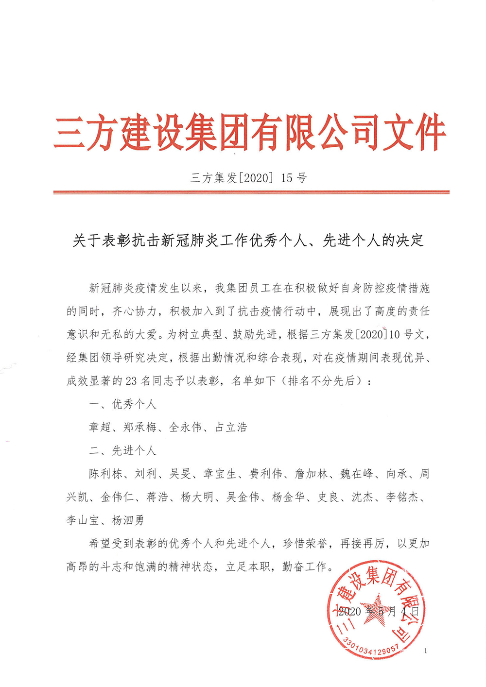 为表扬先进,激发全体员工团结奋战的斗志,弘扬抗击新冠肺炎的精神,集团于2月下旬开展抗击疫情优秀个人、先进个人的评选,通过自荐与推荐的方式,共收到申报材料38份。经集团评优小组评选,最终评选出了4名优秀个人,19名先进个人。