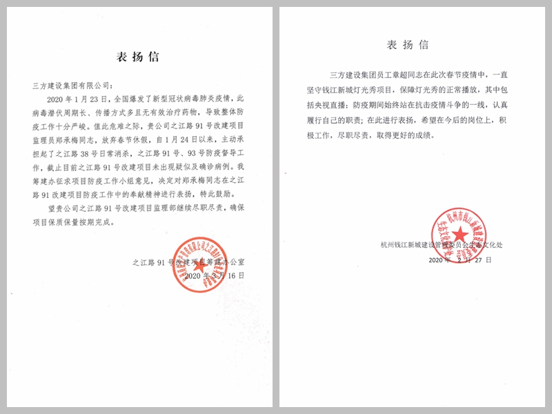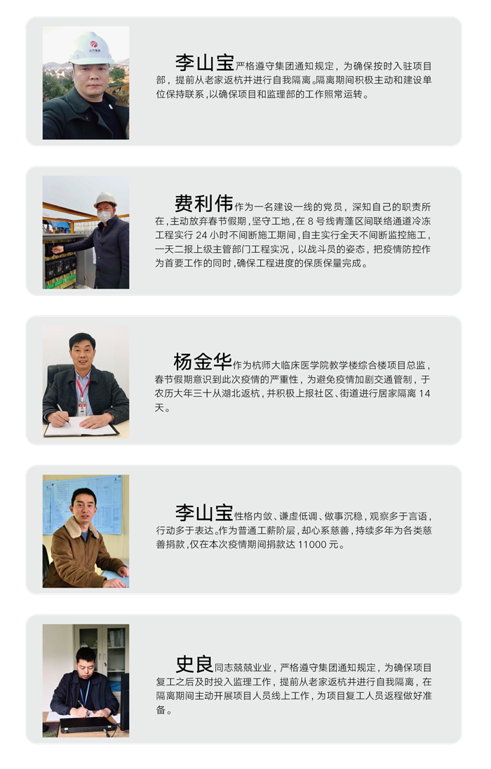 在这场没有硝烟的战争中涌现了许多先进、典型,他们立足本职、担当重任,展现出高度的责任意识和无私的大爱。如湖杭项目詹加林、魏在峰、向承、周兴凯,之江路91号地块郑承梅,钱江新城主题灯光二期章超,地铁8-4项目占立浩、费利伟,金义东8标金伟仁、蒋浩等放弃假期一直坚守工作岗位;如杨金华、杨大明、史良、王长刚等为确保工期提前返岗并自我隔离的积极分子;如沈杰、许卿等长期热心公益,低调捐款的爱心人士...