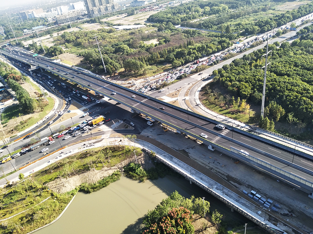 由杭州良渚文化城集团有限公司、杭州市市政公用开发有限公司承建的康桥路至上塘路节点提升工程位于余杭区良渚新城,工程实施范围南起良运街、北至宣杭铁路涵洞南侧,主要内容为上塘路主线高架、康桥路交叉口南侧平行匝道及地面道路等。工程于2017年10月11日正式开工,其中主线高架已于2018年12月底完工并于2019年1月底正式开通;平行匝道与地面道路工程(含一座地面桥)在今年3月中旬第三次交改后全面开始施工,于12月30日全线完成施工任务,并于2020年1月17日顺利通过竣工验收。