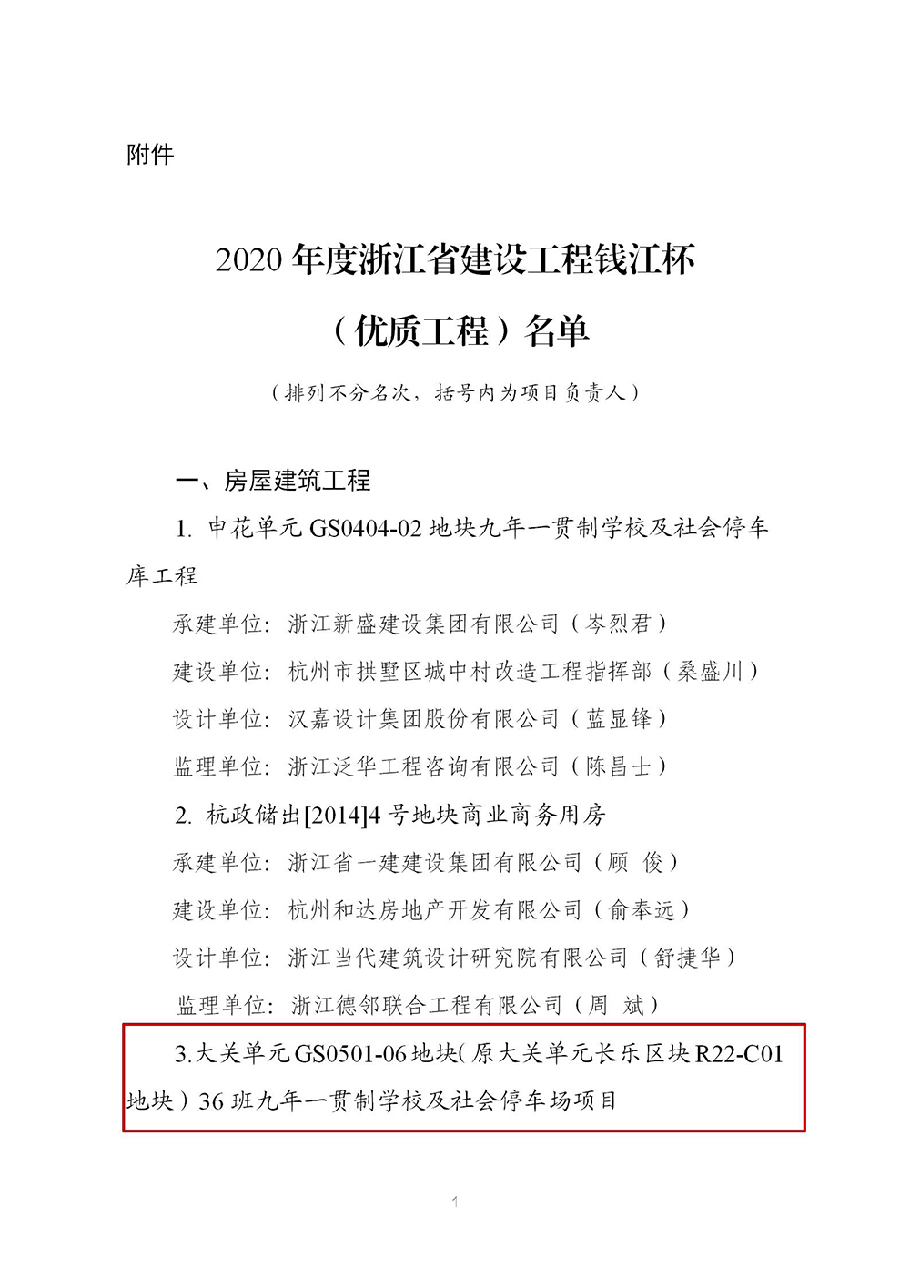 近日,浙江省住房和城乡建设厅正式发文,公布了2020年度浙江省建设工程钱江杯(优质工程)获奖名单(浙建建〔2020〕60号),共157项工程上榜。其中,由集团监理公司负责监理的大关单元GS0501- 06地块(原大关单元长乐区块R22- C01地块)36班九年一贯制学校及社会停车场项目荣获房屋建筑类优质工程殊荣。