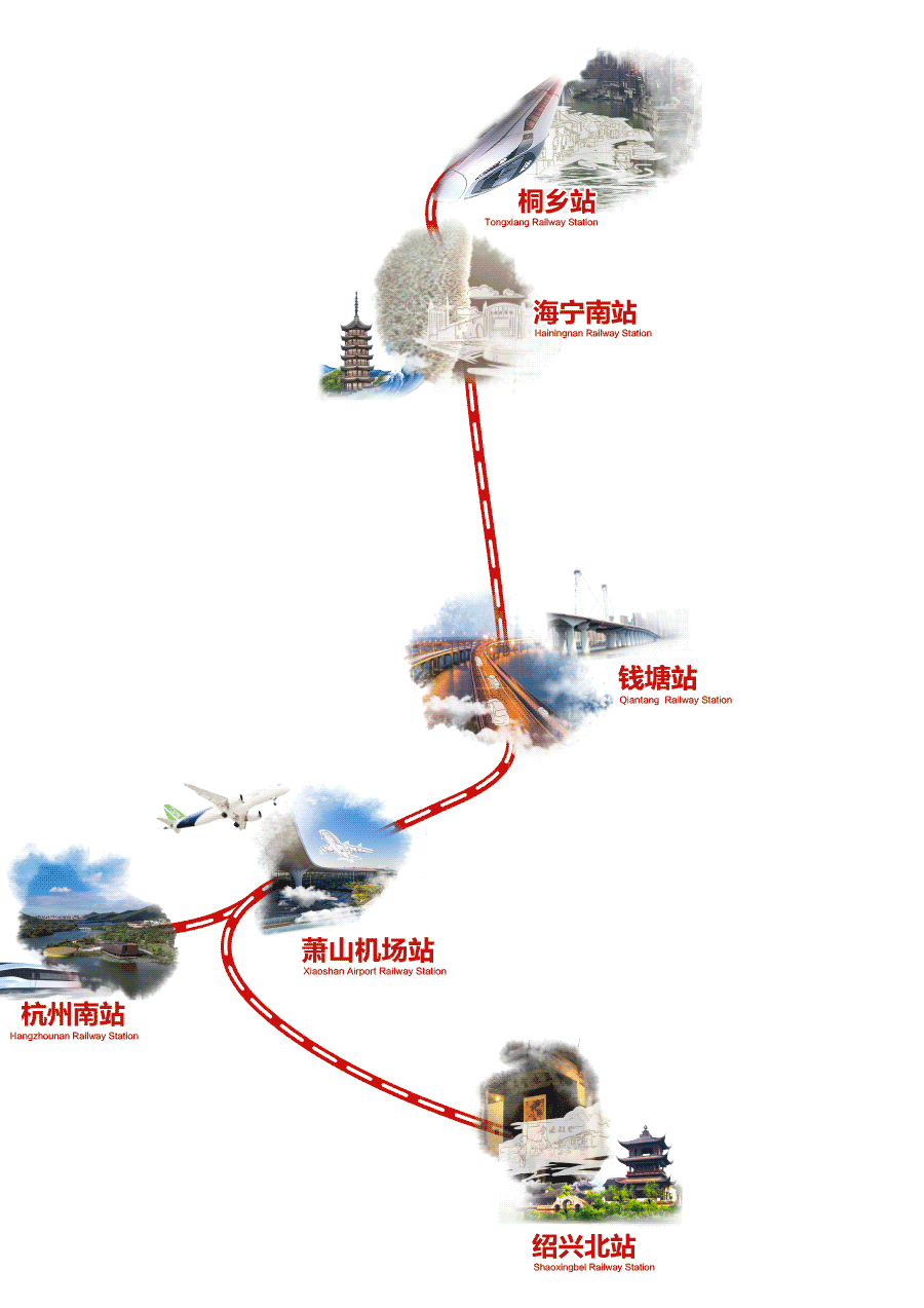 杭州机场高铁全长约85km,途经嘉兴桐乡市、海宁市,杭州钱塘区、萧山区及绍兴柯桥区,其中正线长约72km,萧山机场至杭州南站联络线长约13km,全线新设海宁南站、钱塘站、萧山机场站,改扩建桐乡站,接入绍兴北站,投资总额约383亿元,由杭州交投集团牵头建设。