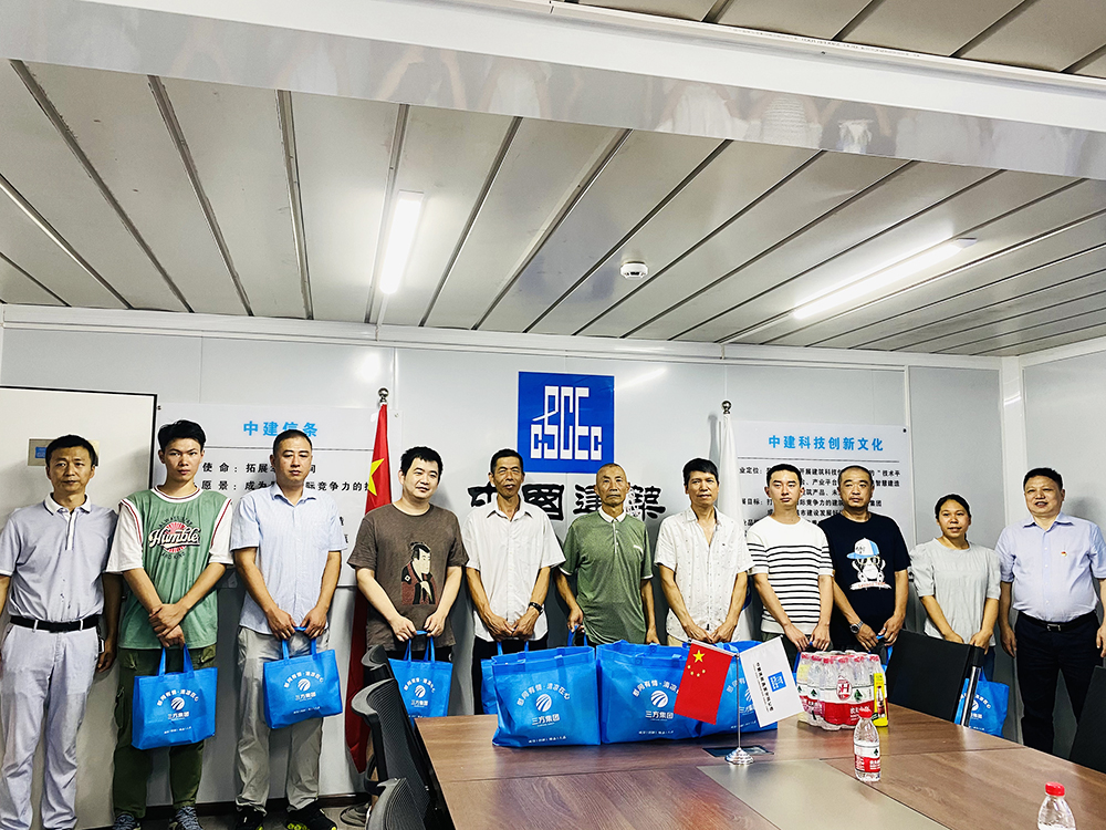 入伏以来,杭州连日处于“高温模式”,炎炎烈日给辛苦奋战在一线的员工们带来了不小的挑战。为做好高温季节防暑降温工作,切实保障集团员工安全健康、确保企业各项经营正常开展,7月16日上午,集团董事长吴祖跃、总工王鹏飞一行赴凯旋单元14地块公租房项目部亲切慰问基层一线员工。一行人向在岗同志发放防暑降温慰问品,为他们送上了夏日中一份宝贵的“清凉”,同时也送去了集团领导真诚的关怀和问候。
