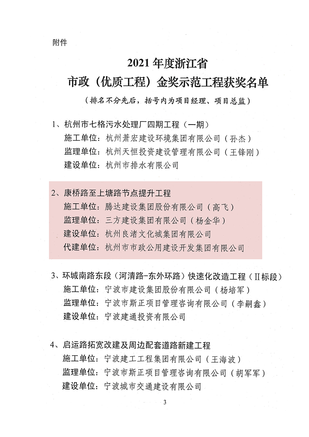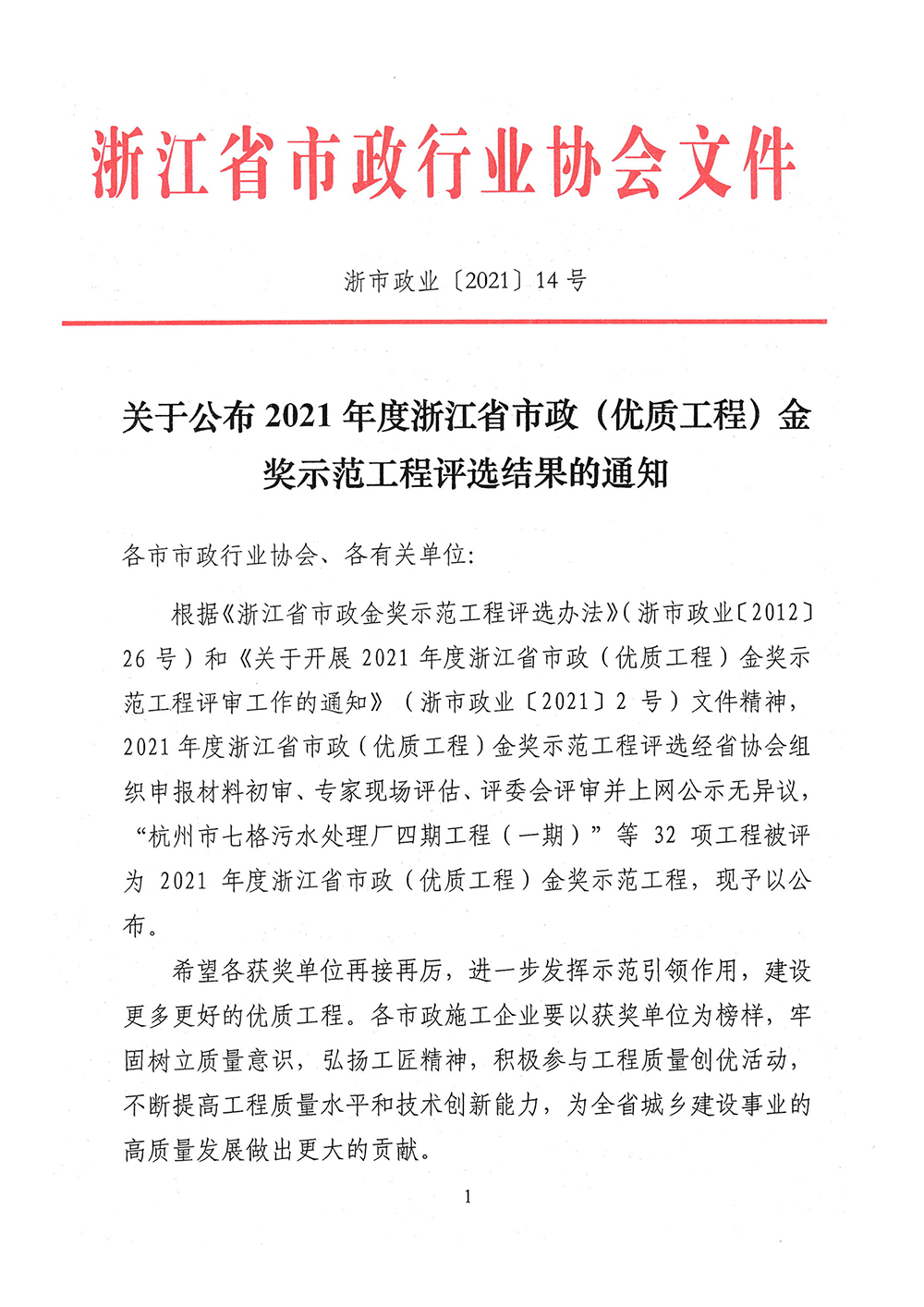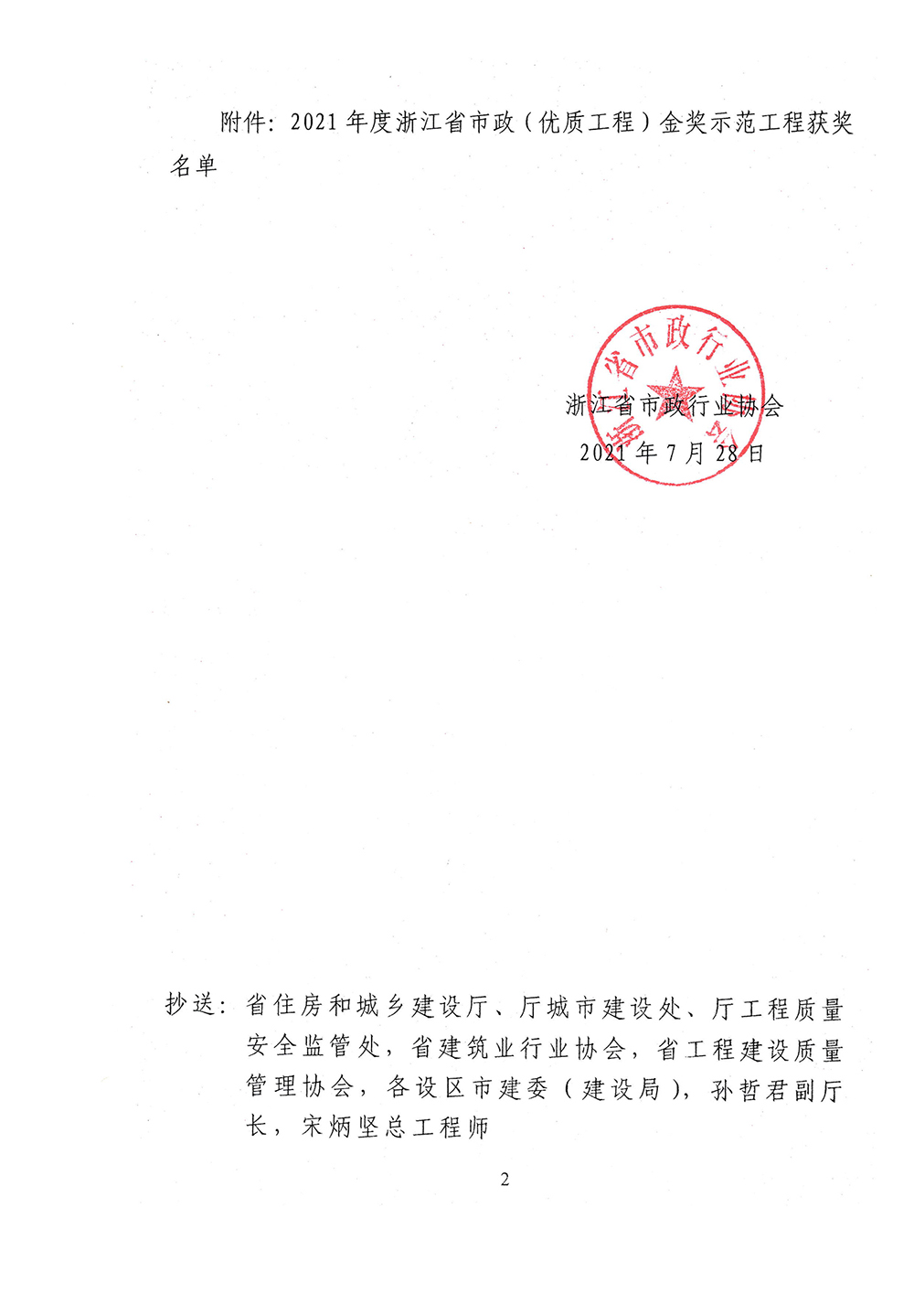 7月28日,浙江省市政行业协会发布《关于公布2021年度浙江省市政(优质工程)金奖示范工程评选结果的通知》。经省协会组织申报材料初审、专家现场评估和评委会评审,我集团监理的康桥路至上塘路节点提升工程荣获2021年度浙江省市政(优质工程)金奖示范工程称号,成为众多参选单位中的佼佼者。