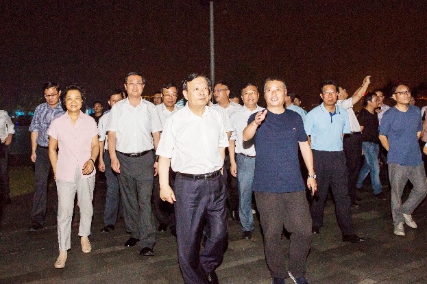 2016年7月16日晚10点,浙江省省委书记、省人大常委主任夏宝龙(左四)、省人民政府省长车俊(左三)一行视察我集团监理的钱江新城城市阳台主题灯光秀工程。
