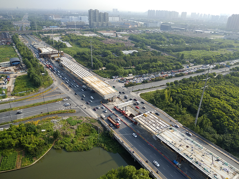 在业主、代建、施工、监理等各方的共同努力下,采取白加黑、5+2的施工模式,克服了保证南北车辆正常通行、拆桥、临近小区、梁板运输、浙江首个预拼装等困难,截至今日上塘高架已完成了 18跨小箱梁安装、2跨钢箱梁安装、三跨现浇箱梁安装,以及全部14片预拼装立柱的预制,并完成了两跨防撞墙模板的安装,目前工程整体进展顺利,为年底主线高架通车打好了基础。