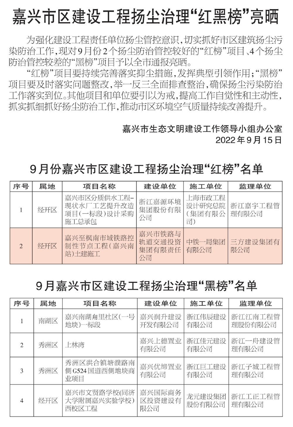 《嘉兴日报》于9月20日第二版中刊登《嘉兴市区建设工程扬尘治理“红黑榜”亮晒》,对9月份嘉兴市区建设工程扬尘防治管控进行全市通报亮晒,我集团监理的嘉兴至枫南市域铁路控制性节点工程(嘉兴南站)土建施工项目被列入“红榜”表彰,全市仅2个。