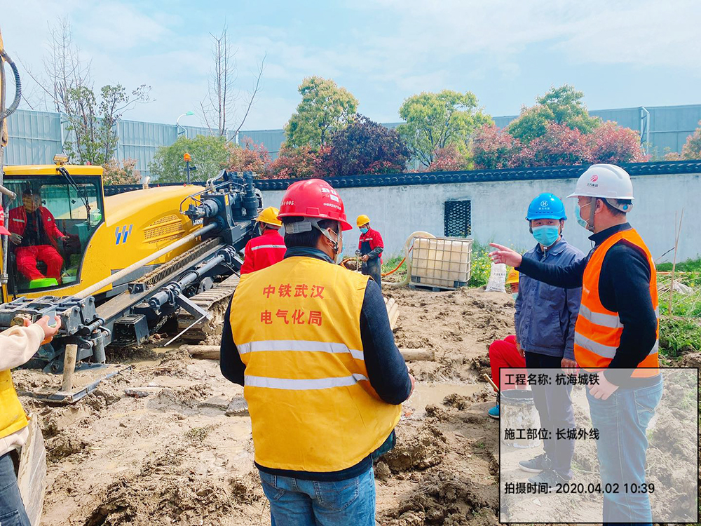 为切实掌握施工难点,监理部协同项目部技术人员多次深入现场调查施工难点。长城主所110kV外电源施工需穿越G525国道,道路来往车辆及行人密集,且重卡较多,无法进行开挖施工;且地下管线密集、错综分布;此次顶管施工地下穿越长度较长,几乎达到顶管作业的极限,且回拖阻力随长度的增大而增大,对成孔质量、对路面安全影响都要求很高;同时管道安装场地有限,无法满足一次性安装到拖拉长度,需拖拉的同时进行安装,对管道的安装便捷性也是一大挑战。加之受此次新冠肺炎疫情影响,部分技术人员因涉及湖北籍未能及时返程,为确保施工顺利进行,杭海公司、设计、监理、施工及水务、燃气、国防光缆等相关管线权属单位召开了多次现场会议商讨施工对策,最终确定了完整的施工技术方案,采取水平定向钻孔(HDD)拖拉管施工工艺,这样可以最大限度地减少对道路交通、草坪、周边树木及其他活动的干扰。
