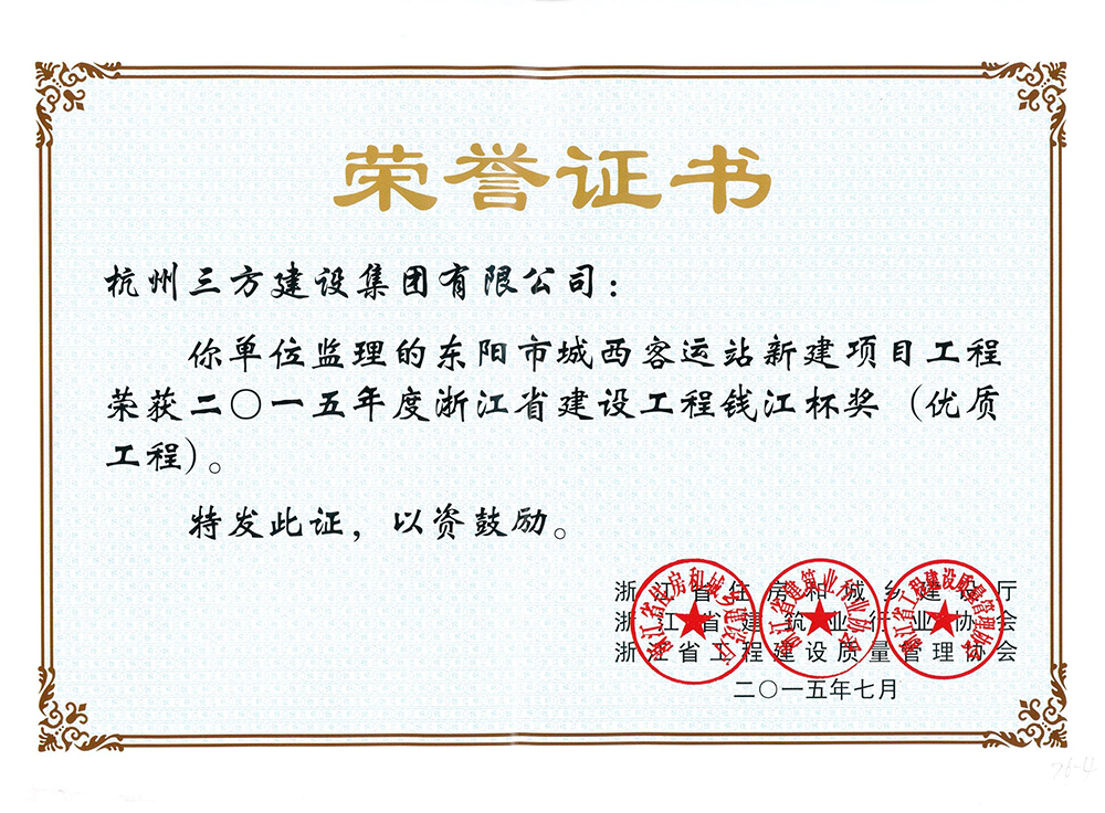 我集团监理的东阳市城西客运站新建项目、东阳市人民医院巍山分院病房综合楼工程获得浙江省优质工程“钱江杯”荣誉。