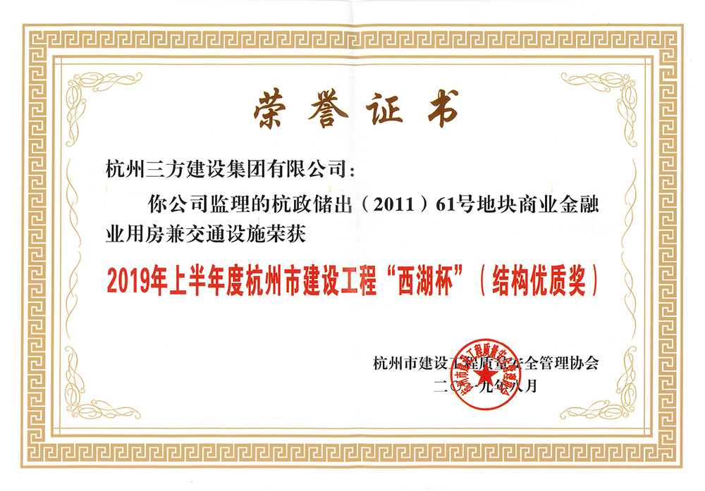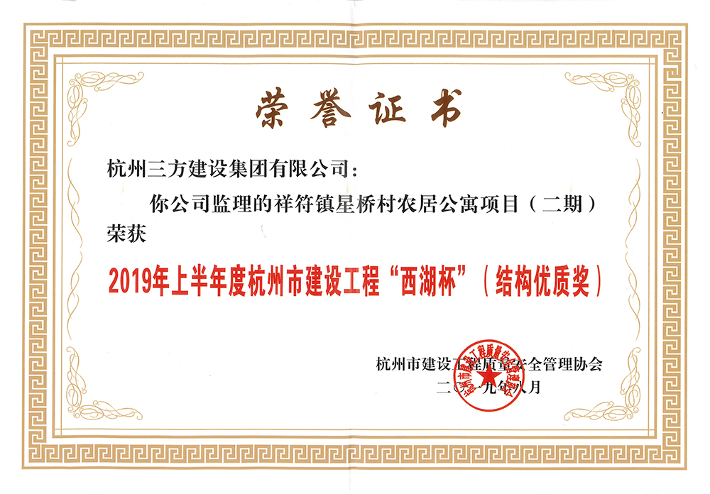 8月30日,杭州市建设工程质量安全管理协会发布获奖通报,集团监理的祥符镇星桥村农居公寓项目(二期)、杭政储出(2011)61号地块商业金融业用房兼交通设施项目荣获2019年上半年度杭州市建设工程“西湖杯”(结构优质奖)。