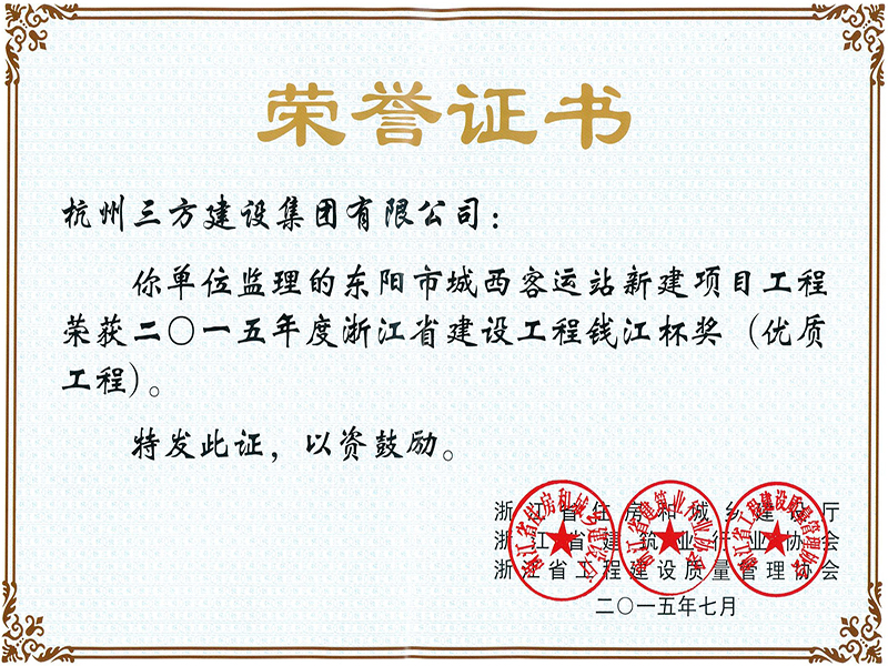 2015年东阳市城西客运站新建项目工程荣获浙江省建设工程钱江杯奖(优质工程)