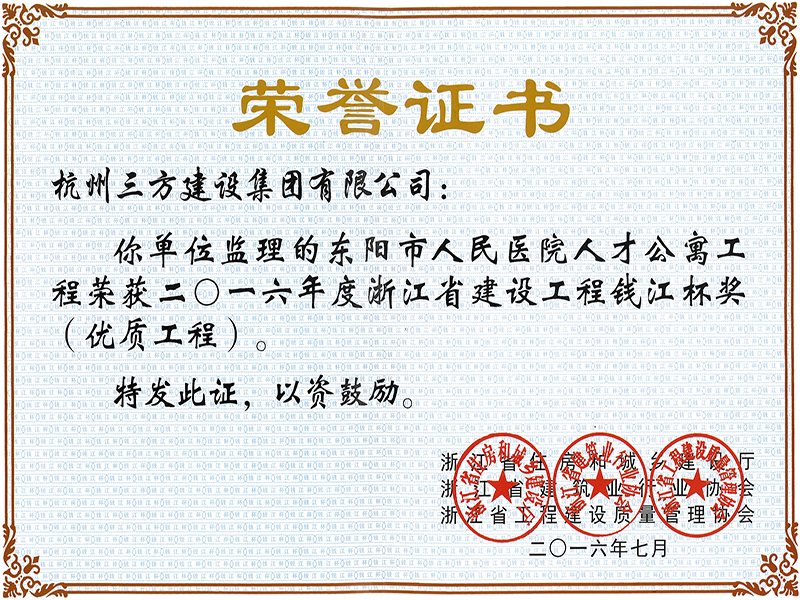 2016年东阳市人民医院人才公寓工程荣获浙江省建设工程钱江杯奖(优质工程)