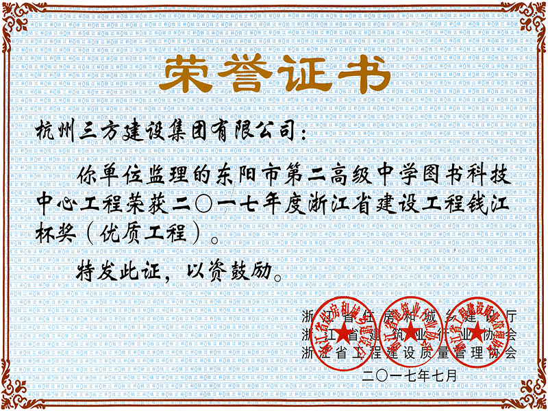 2017年东阳市第二高级中学图书科技中心工程荣获浙江省建设工程钱江杯奖(优质工程)