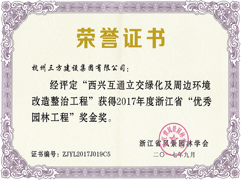 2017年“西兴互通立交绿化及周边环境改造整治工程”获得浙江省“优秀园林工程”奖金奖