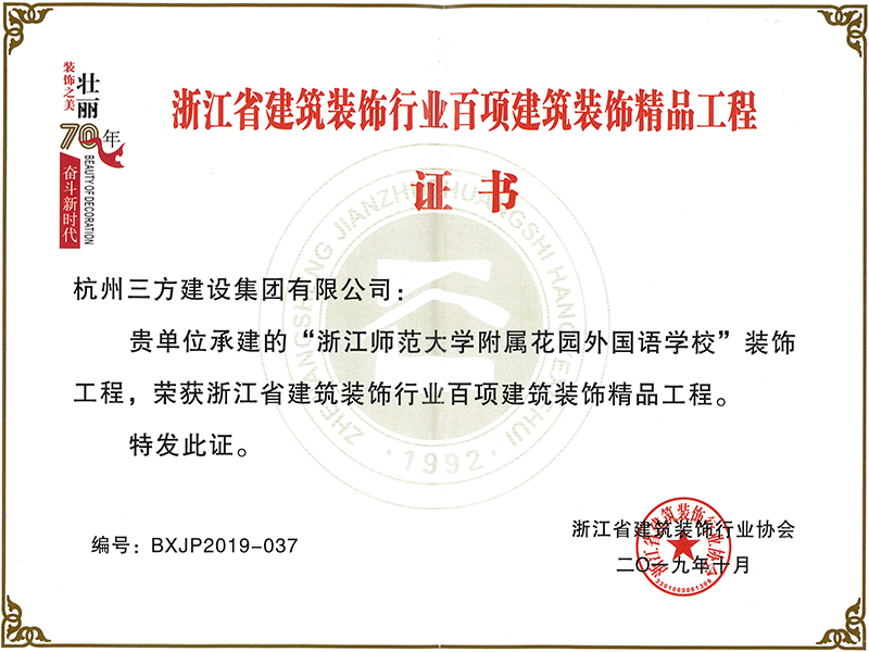 2019年“浙江师范大学附属花园外国语学校”装饰工程荣获浙江省建筑装饰行业百项建筑装饰精品工程