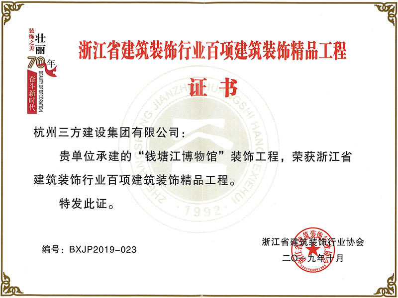 2019年“钱塘江博物馆”装饰工程荣获浙江省建筑装饰行业百项建筑装饰精品工程