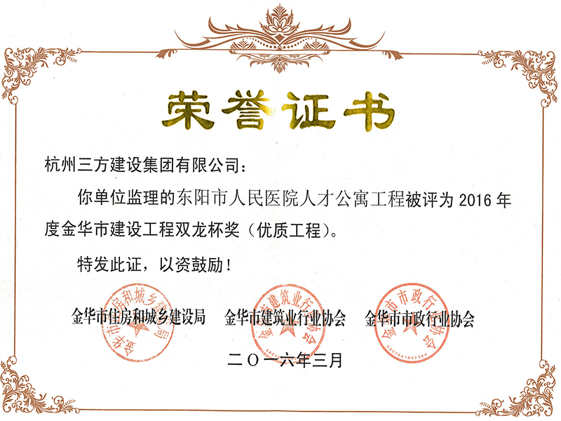 2016年东阳市人民医院人才公寓工程被评为金华市建设工程双龙杯奖(优质工程)
