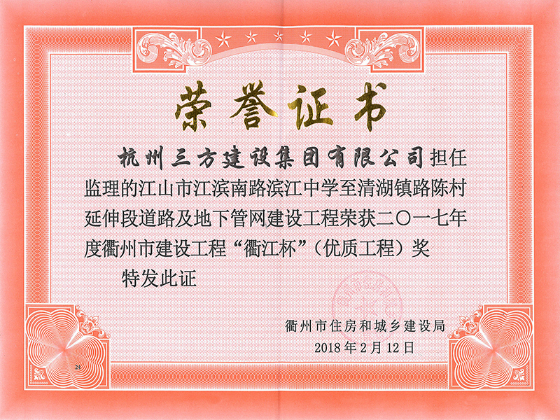 2018年江山市江滨南路滨江中学至清湖镇路陈村延伸段道路及地下管网建设工程荣获衢州市建设工程”衢江杯“(优质工程)奖