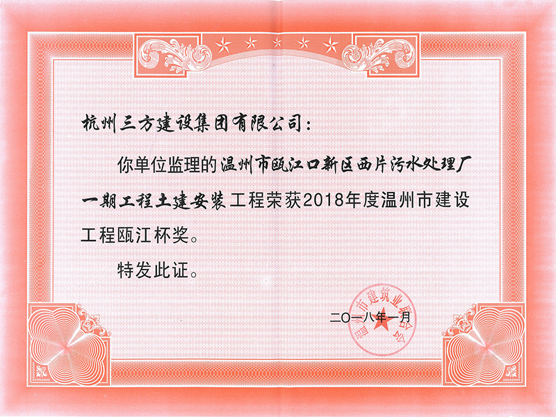 2018年温州市瓯江口新区西片污水处理厂一期工程土建安装工程荣获温州市建设工程瓯江杯奖