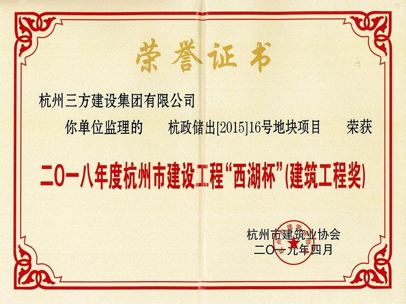 2018年杭政储出【2015】16号地块项目荣获杭州市建设工程”西湖杯“(建筑工程奖)