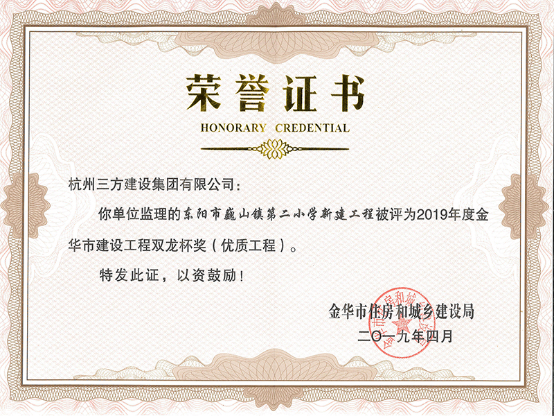 2019年东阳市巍山镇第二小学新建工程被评为金华市建设工程双龙杯奖(优质工程)