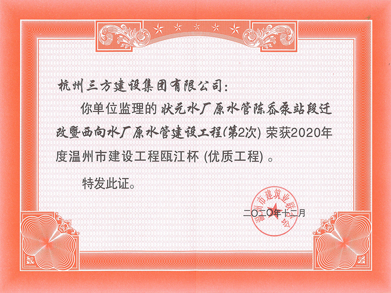 2020年状元水厂原水管陈岙泵站段迁改暨西向水厂原水管建设工程(第2次)荣获温州市建设工程瓯江杯(优质工程)