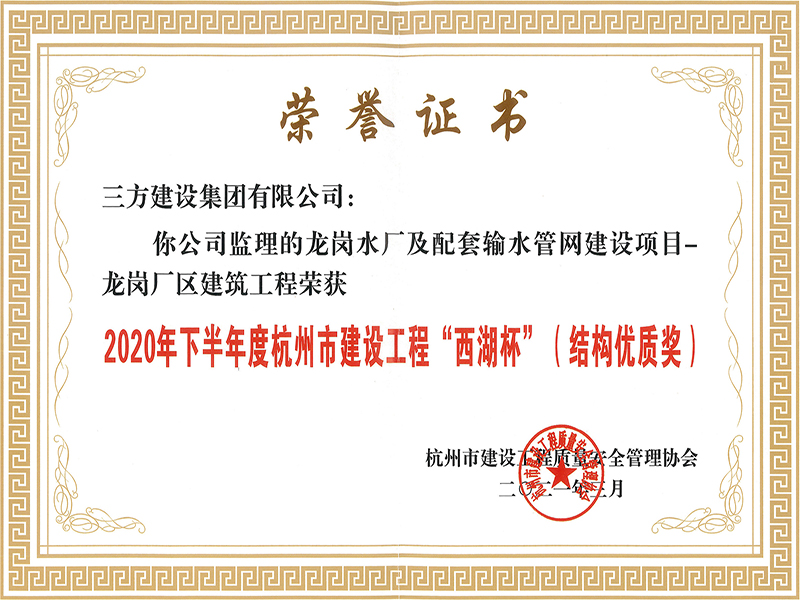 2020年下半年度龙岗水厂及配套输水管网建设项目-龙岗厂区建筑工程荣获杭州市建设工程“西湖杯”(结构优质奖)