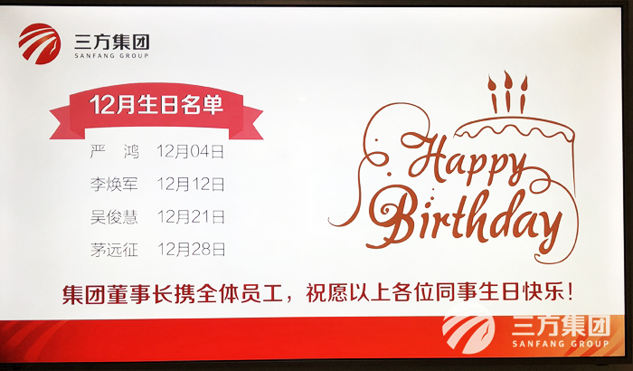 月初,集团办公室的电子屏幕已滚动播放董事长对各位同事的生日祝福。公司的发展离不开每一位员工的辛勤工作,在大家生日到来之际,董事长谨代表公司全体同仁祝福大家生日快乐!感谢大家这些年在自己的工作岗位上兢兢业业为公司作出的贡献,在以后的日子里希望再接再厉,让公司与大家共同成长!